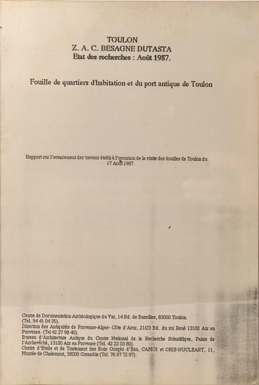 Centre d'archeologie du var 1987 in4. 1987. format these. Cet ouvrage présente les résultats de fouilles archéologiques menées sur les quartiers d'habitation du port antique de Toulon. Il documente l'organisation urbaine et la vie quotidienne dans ce secteur portuaire durant l'Antiquité