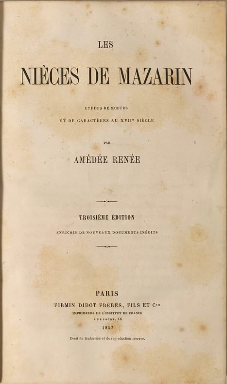 Firmin Didot Frères Fils et Cie 1857 556 pages in8. 1857. reliure éditeur demi basane dos à nerfs. 556 pages. Il s'agit de la troisième édition enrichie d'un recueil de documents et édits liés à Mazarin publiée par l'éditeur Firmin Didot. L'ouvrage présente des sources historiques concernant cette figure importante du XVIIe siècle français