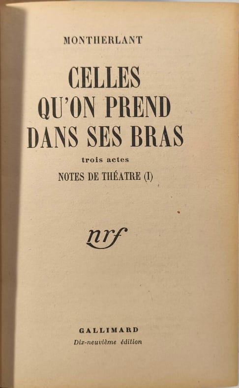 Gallimard 1950 216 pages in12. 1950. reliure editeur demi cuir. 216 pages. Pièce de théâtre de Henry de Montherlant publiée chez Gallimard probablement dans les années 1950-1960 explorant les dynamiques relationnelles et les conflits intérieurs entre personnages à travers un drame psychologique