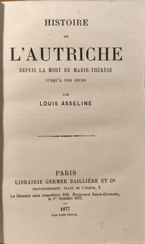 Librairie Germer Baillière et Cie 1877 360 pages in12. 1877. reliure editeur dos à nerfs. 360 pages. Ouvrage historique de Louis Asseline retraçant l'histoire de l'Autriche depuis la mort de l'impératrice Marie-Thérèse (1780) jusqu'à l'époque contemporaine de l'auteur publié par la Librairie Germer Bailli Cie