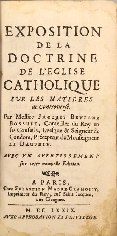 Sébastien Mabre-Cramoisy 1679 215 pages in12. 1679. reliure editeur. 215 pages. Ouvrage théologique de Jacques-Bénigne Bossuet exposant la doctrine officielle de l'Église catholique sur les questions controversées de son époque servant d'outil apologétique pour défendre et expliquer les positions catholiques face aux critiques et aux débats religieux