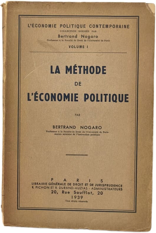 Librairie Générale de Droit et de Jurisprudence 1939 275 pages in8. 1939. broché. 275 pages. Méthode d'économie politique de Bertrand Nogaro est un manuel académique publié par la Librairie générale de droit et de jurisprudence destiné à l'étude et à l'enseignement de l'économie politique