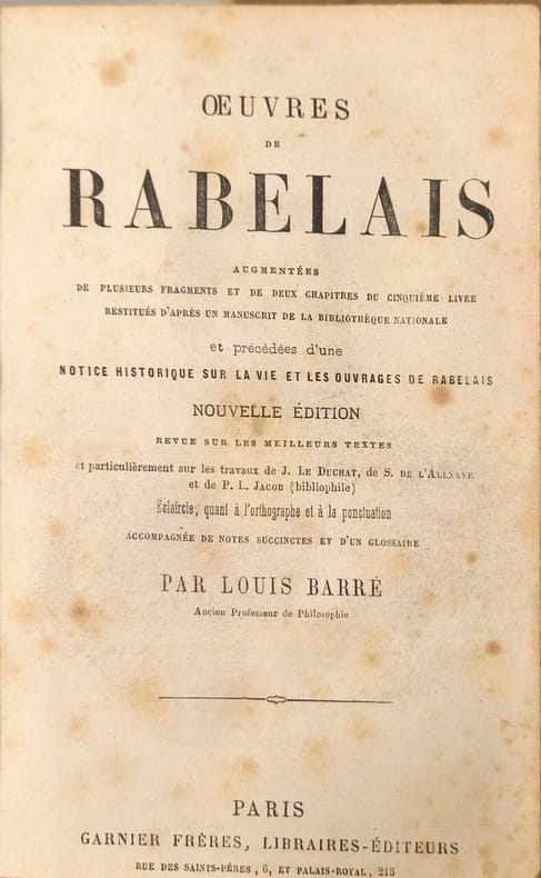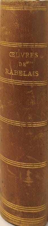 Paris, Dalibon (Jules Didot l'Aîné) puis T.8 et 9, G. Doyen, 1823 ; 9 tomes in-8, demi-maroquin rouge à coins, dos à nerfs, titre doré, tête dorée (Raparlier). Portrait de Rabelais par Devéria, gravé par Leisnier et Forster, carte dépliante du Chinonois, 10 figures par Devéria dont un deuxième portait, gravées à l'eau-forte, et 120 dessins de Rabelais gravés sur bois.