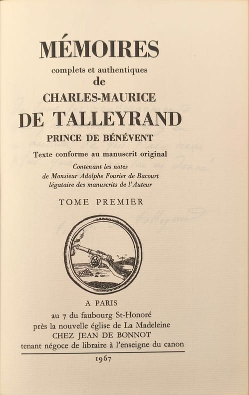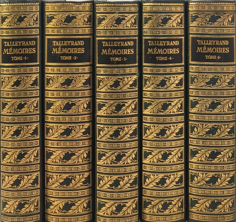 Paris Jean de Bonnot 1967 in 8 (21x14,5) 5 volumes reliures plein cuir vert ornées de l'éditeur, plats ornés d'un double encadrement de guilandes dorées avec un décor central de 3 fers dorés au lion, têtes dorées, [5] 459 pages, 560 pages [3], 469 pages [2], 499 pages [2], et 512 pages et table non chiffrée, avec des illustrations hors-texte en noir et blanc. Texte conforme au manuscrit original contenant les notes de Monsieur Adolphe Fourier de Bacourt légataire des manuscrits de l'auteur. On joint un volume: LETTRES DE TALLEYRAND A NAPOLÉON (même éditeur, même date, même reliure). Charles-Maurice de Talleyrand-Périgord, dit prince de Talleyrand, Paris 1754-1838, homme d'Etat et diplomate français. Ensemble 6 volumes. Très bel exemplaire ( Photographies sur demande / We can send pictures of this book on simple request )