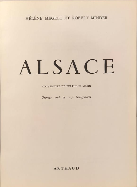 ARTHAUD 1958 245 pages in8. 1958. pleine toile editeur sous rhodoid. 245 pages. Ouvrage consacré à l'Alsace illustré par Berthold Mahn et orné de 205 héliogravures publié par les éditions Arthaud sous la direction d'Égret Minder. Le livre présente vraisemblablement le patrimoine les paysages ou la culture alsacienne à travers une riche iconographie