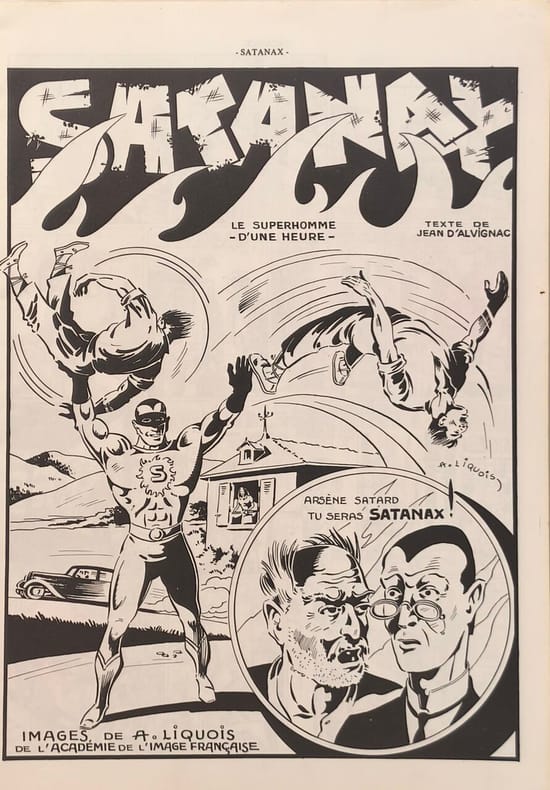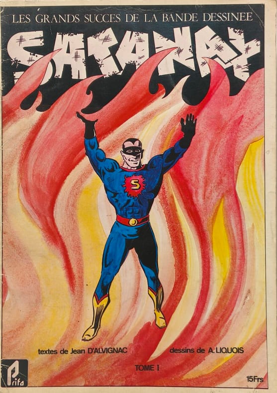 Editions Prifo / Collection " Les grands succès de la bande dessinée" 1977. Deux volumes in-4 brochés, paginés en continu, pour un total de 96 pages au format 30 x 21 cm. Couvertures illustrées. Plats et intérieur frais, malgré d'infimes frottis et tassements aux coins. Illustrations en noir de Auguste Liquois sur scénarios de Jean D'Alvignac. Bel état général. Edition originale, collective, complète en 2 volumes. Le tome 3, pourtant annoncé, ne fut jamais édité.Suite à la création aux états-unis de Batman, Superman, etc, la nouvelle science-fiction française d'après-guerre lance elle aussi la création en bande dessinée de super-héros français comme Fulguros en 1947, Satanax et Atomax en 1948. Jean D'Alvignac et Auguste Liquois, invente Arsène Satard. Cet humble greffier de cour, se voit attribuer des pouvoirs surhumains par un vieil alchimiste. et ce lorsqu’il est mis en contact avec le feu. Il se transforme alors en un super-puissant combattant du crime, connu sous le nom de Satanax. Mais malheureusement ll ne peut rester sous cette forme qu’une heure. Les seize numéros de " Satanax ", furent publiés aux Editions Mondiales en 1948 et 1949.
