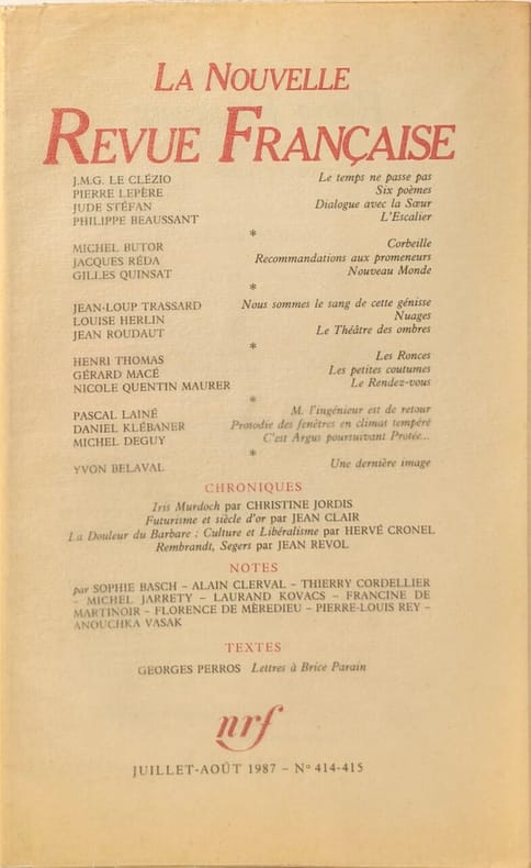 nrf 1987 312 pages in8. 1987. broché. première édition. 312 pages. Impossible de fournir un résumé précis car le contenu fourni ne décrit pas un livre spécifique mais fait référence à la Nouvelle Revue Française (NRF) une célèbre revue littéraire française fondée en 1909 et publiée par les Éditions Gallimard