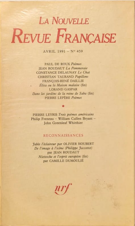 NRF 1991 128 pages in8. 1991. broché. première édition. 128 pages. Il s'agit d'une publication de la Nouvelle Revue Française (NRF) revue littéraire française fondée en 1909 rassemblant probablement des textes de divers auteurs publiés dans cette revue mythique. L'ouvrage présente un panorama de la littérature française du XXe siècle à travers les contributions parues dans la NRF