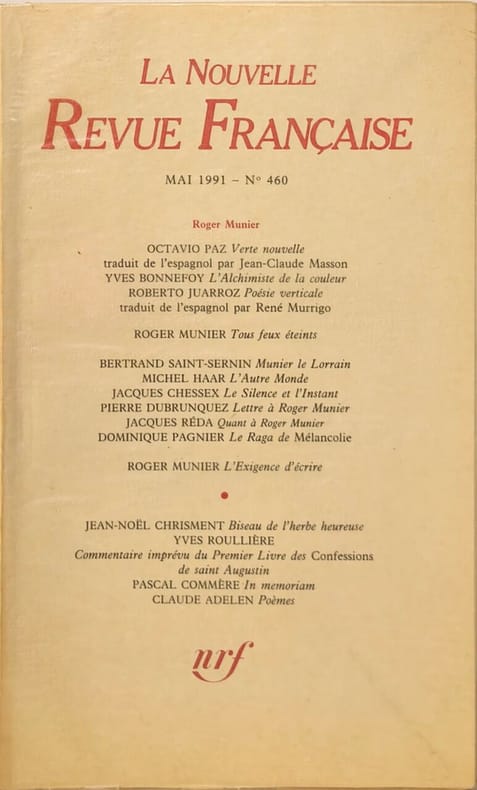 nrf 1991 128 pages in8. 1991. broché. première édition. 128 pages. Il s'agit d'une publication de la Nouvelle Revue Française (NRF) revue littéraire française fondée en 1909 rassemblant probablement des textes de divers auteurs publiés dans cette revue mythique. L'ouvrage présente un panorama de la littérature française du XXe siècle à travers les contributions parues dans la NRF