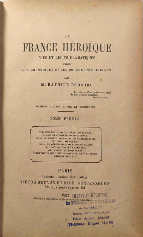 SOMMAIRE : TOME 1 (4e edition) : Vercingétorix, La Gaule chrétienne, Clovis et Clotilde, Brunehaut, Ch. Martel, Gestes de Charlemagne, Roland, Rollon.... + TOME 2 : Saint Louis - Le grand Ferré - eustache de Saint pierre - Charles le sage - Duguesclin - De pontblanc - Boucicaut - Juvenal des ursins - Jean d'Arc - Charles VII - Jeanne Hachette - Bayard - La palice - Guise + TOME 3 : Tavannes. Crillon. Henri IV. Lesdiguières. Fabert. Richelieu. Turenne. Louis XIV. Condé. Luxembourg. Vauban. Catinat. Villars + TOME 4 : Montcalm - Chevert - Marceau - Lazare Hoche - La Tour dAuvergne - Desaix - Les Vendéens - Napoléon - Lannes - Poniatovski - Doumesnil - Cambronne - Drouot - Bugeaud - La dernière guerre 1870-1871.. Classification Dewey : 944-Histoire de France varia