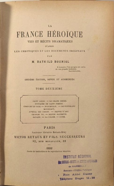 Tome 2 : Saint Louis, le grand Ferré, Eustache de Saint Pierre, Charles Lesage, Duguesclin, Depontblanc, Boucicaut, Juvenal des Ursins, Jeanne d'Arc, Charles VII, Jeanne Hachette, Bayard, La palice, Guise - Tome 3 : Tavannes, Chillon, Henri IV, Lesdiguières, Fabert, Richelieu, Louis XIV, Turenne, Condé, Luxembourg, Vauban, Catinat, Villars - Tome 4 : Montcalm, Chevert, Louis Seize, Marceau, Lazare Hoche, la tour d'Auvergne, Desaix, les vendéens, Napoléon, Lannes, Daumenil, Cambronne, Drouot, Bugeaud. Classification Dewey : 904-Recueils de récits d'événements