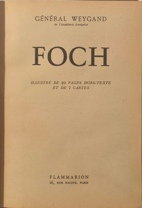 Flammarion 1947 in8. 1947. Relié. Foch - illustré de 20 pages hors texte et de 7 cartes + coupure de presse + enveloppes et carte du Général Weygan et du Maréchal Foch + Lettre de Weygand adressés au Comte Ernest de Ganay historien des jardins et des châteaux