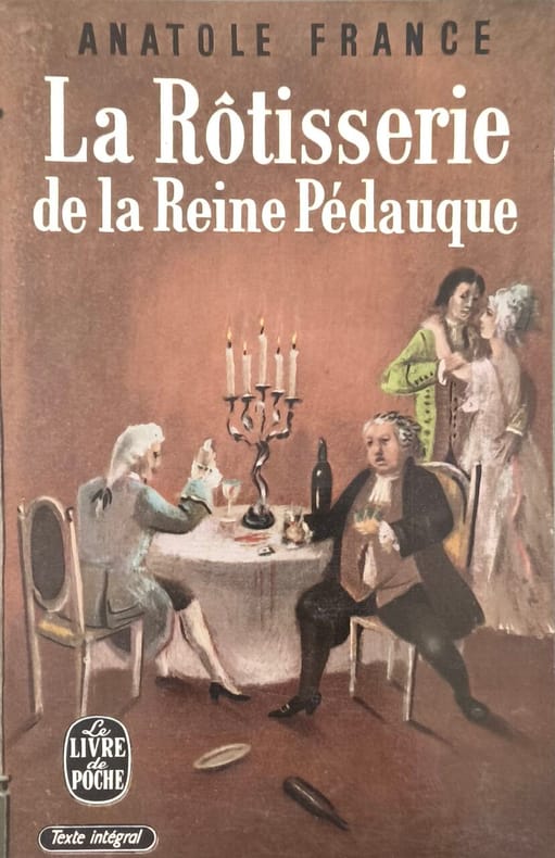 Imposant succès de l'auteur, La Rotisserie de la Reine Pédauque « la plus significative de ses oeuvres» est aussi celle de la maturité. À l'été, 1892, France, qui passe l'été avec sa fille Suzanne à Saint-Thomas, petite village de l'Aisne, termine cet imposant roman de plus de 600 pages. Le 10 août écri-il à un ami que sa reine Pédauque est «arrivé au 496° feuillet [...]. Le romancier a apporté son manuscrit dans sa valise ». En septembre, La Rotisserie est achevée et dès le 6 octobre elle commence à paraître en feuilletons dans L'Échos de Paris. Les origines du plus célèbre des romans de France puise allègrement dans les oeuvres les plus singulières du XVIIIe siècle, époque qui eût toujours sa préférence. Le personnage de l'abbé Coignard, le rôtisseur de la rue Saint-Jacques, maître Léonard et d'autres encore tout aussi savoureux ornent cette oeuvre qui inquiéta son auteur jusqu'à sa première publication. Le 5 octobre 1892, pris d'un doute affreux alors que L'Échos en publie les première pages, il écrit à sa confidente Madame de Caillavet «La Rôtisserie est toute à refaire. Je suis accablé...» Le 22 mars 1893 le texte paraît en volume chez Calmann Lévy. L'on sait la suite et son succès. Peu de titres dans la littérature de la fin du XIXe on connût un tel engouement, y compris bibliophilique. Outre les retirages nombreux et les éditions illustrées, les collectionneurs donnèrent aux plus grands ateliers cette Rotisserie qui fut admirablement et précieusement reliée. L'éditeur fit imprimée 20 japon et 40 hollande sous couverture orange - pour ne donner qu'un exemple citons celui de l'exemplaire du Bourg de Bozas sur japon relié par Meunier, assez dans le goût de l'époque. Il est amusant de noter enfin, que le libraire Conquet, avisé et prudent, à la suite de cet impressionnant succès, souscrivit auprès de l'éditeur à tous les futurs grands papiers des oeuvres de France. Le billet conservé dans cet exemplaire est adressé au poète algérianiste Albert Tustes (1888-1943). Il est l'auteur des Sirénéennes lauréat du grand Prix de l'Algérie en 1927.
