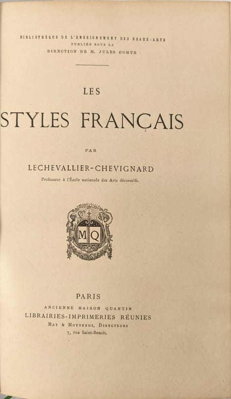 Ancienne Maison Quantin Librairies-Imprimeries Réunies 1892 375 pages in8. 1892. reliure éditeur demi chagrin dos à nerfs. 375 pages. Ouvrage publié en 1892 par l'ancienne maison Quantin analysant les différents styles français à travers l'histoire avec un focus sur le décor le pastiche et les influences étrangères. Le livre contient de nombreuses illustrations en noir et blanc