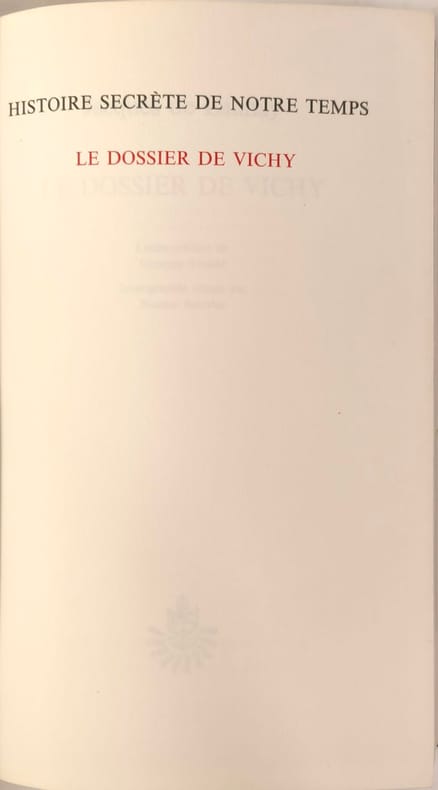 Non pas tout Vichy. Mais des conventions d'armistice à la Révolution nationale, de l'action constitutionnelle à la politique de collaboration, de la rupture franco-britannique aux rapports avec les Etats-Unis, une série de document parfois inédits, d'accès toujours difficile, et jamais regroupés sur plusieurs aspects fondamentaux du régime. — "... Plus qu'aux hommes dont les visages demeurent quelquefois dans la pénombre, plus qu'à la guerre ou à l'occupation dans leurs traits quotidiens, Jacques de Launay s'est attaché à l'histoire diplomatique et juridique du régime de Vichy : signature des armistices, coup d'Etat du 11 juillet 1940, rupture franco-britannique, collaboration avee l'Allemagne, relations franco-américaines, etc. Sans prétendre tous à l'originalité, les pièces et documents présentés ont le mérite d'apporter de la clarté dans le récit d'événements enchevêtrés, et de relations diplomatiques qui tinrent plus souvent de l'intrigue que de la négociation. Et malgré le caractère glacé, selon l'auteur, que donne la présentation dépouillée propre à la collection Archives, ce Dossier de Vichy laisse transparaître l'atmosphère de défaite et de désarroi d'un régime et d'une Cour où le grotesque le dispute souvent ä la tragédie. Qu'il y ait eu, au milieu de tant de lâchetés et de trahisons, des Français pour tenter de sauver ce qui pouvait l'être, pour songer à un avenir meilleur et aux moyens d'y parvenir, est finalement l'aspect le plus paradoxal et intéressant de ces quatre années de misère. Aussi est-ce avec raison que Jacques de Launay conclut son propos par un bref rappel de ce qui devait subsister de la révolution nationale dans les idées et les réalisations de la Résistance dejà, puis de la IVe et de la Ve république." (J- C. Favez, Revue suisse d'histoire, 1968)