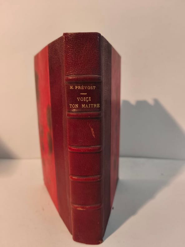 Edition originale, un des 965 exemplaires numérotés sur alfa. Reliure en demi chagrin maroquiné marron chocolat à coins, dos à cinq nerfs, plats de papier marbré, gardes et contreplats de papier à la cuve, couvertures et dos conservés, tête dorée, reliure de l'époque signée de A. Broulet, relieur niortais. Un petit accroc sans gravité en tête du dos. Signature de Marcel Prévost sur la page de faux-titre. - Photographies et détails sur www.Edition-Originale.com -
