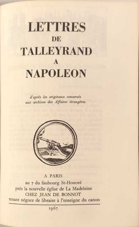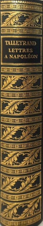 1967 Paris, Jean de Bonnot, 1967, 5 volumes reliures d'éditeur plein cuir façon maroquin grains longs vert Empire, plats ornés d'un double encadrement de guirlandes dorées avec un décor central de 3 fers dorés au lion, têtes dorées, (5)-459 ; 560-(3) ; 469-(2) ; 499-(2) et 512 pp. et table non chiffrée, avec des illustrations hors-texte en noir et blanc. Texte conforme au manuscrit original contenant les notes de Monsieur Adolphe Fourier de Bacourt légataire des manuscrits de l'auteur. On joint un volume : "Lettres de Talleyrand à Napoléon" (même éditeur, même date, même reliure). Ensemble 6 volumes. Très bel exemplaire.