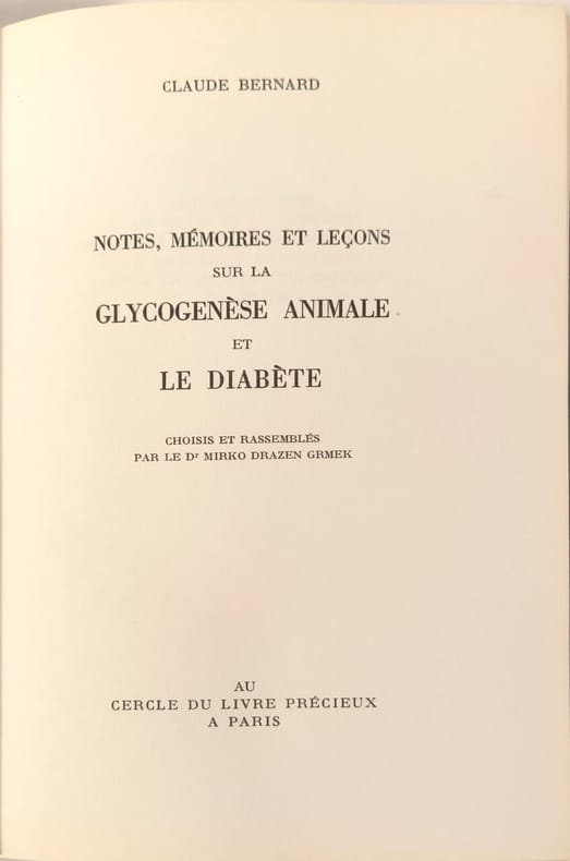 Cercle du livre précieux Paris 1965 266 pages in8. 1965. reliure editeur. 266 pages. Recueil de textes scientifiques de Claude Bernard rassemblant ses notes mémoires et leçons sur la glycogénèse animale et le diabète publié par le Cercle du livre précieux en 1965. L'ouvrage présente ses travaux de recherche en physiologie et médecine expérimentale