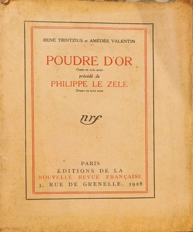 Éditions de la Nouvelle Revue Française 1928 268 pages IN8. 1928. broché. 268 pages. Poudre d'or est un conte en trois actes précédé de Philippe le Zélé un drame en trois actes. L'œuvre est une pièce de théâtre écrite en collaboration par René Trintzius et Amédée Valentin publiée en 1928 par les éditions de la Nouvelle Revue Française