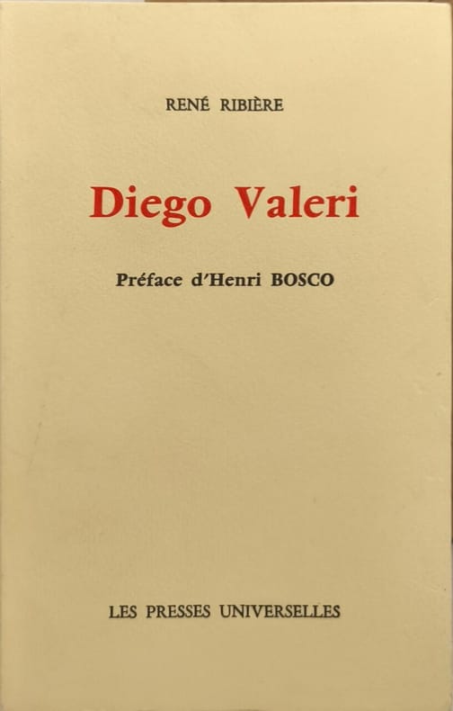 Les Presses Universelles 1971 192 pages in8. 1971. broché. 192 pages. Cet ouvrage est un essai consacré au poète italien Diego Valeri (1887-1976) comprenant une sélection de ses textes traduits une bibliographie des portraits et des fac-similés. Il est préfacé par Henri Bosco et publié par René Ribière aux Presses Universelles en 1971