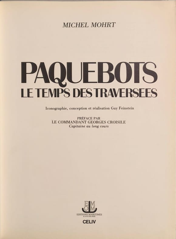"Edtions Maritimes et d'Outre-mer. 1980. In-Folio. Relié. Bon état, Couv. convenable, Dos satisfaisant, Intérieur frais. 278 pages augmentées de nombreuses photos en noir et blanc hors texte. 6 cartes postales et photos de paquebots ainsi qu'un article de journal ""Le Havre Libre"" sur Clément Grangier et extraits de programme télé en suppléments Jaquette tâchée.. Avec Jaquette. . . Classification Dewey : 386-Marine"