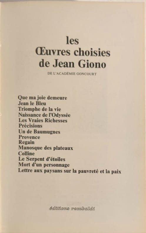 éditions rombaldi 1977 59 pages in8. 1977. reliure editeur. 59 pages. Il s'agit d'une édition des "Œuvres choisies" de Jean Giono publiée par les éditions Rombaldi probablement dans les années 1970. Cette édition se présente en plusieurs volumes (cinq selon une source) et est caractérisée par une reliure et des illustrations de qualité réalisées par des peintres renommés des années 1950-1960 comme Edy-Legrand Jean Carzou ou André Masson