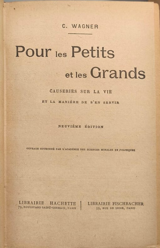 Librairie Hachette | Librairie Fischbacher 1909 404 pages in8. 1909. reliure éditeur demi basane dos à nerfs. 404 pages. Ce livre de Charles Wagner est un recueil de causeries qui abordent la vie et la manière d'en tirer le meilleur parti. Il s'adresse à un public large des enfants aux adultes dans un style accessible et moralisateur