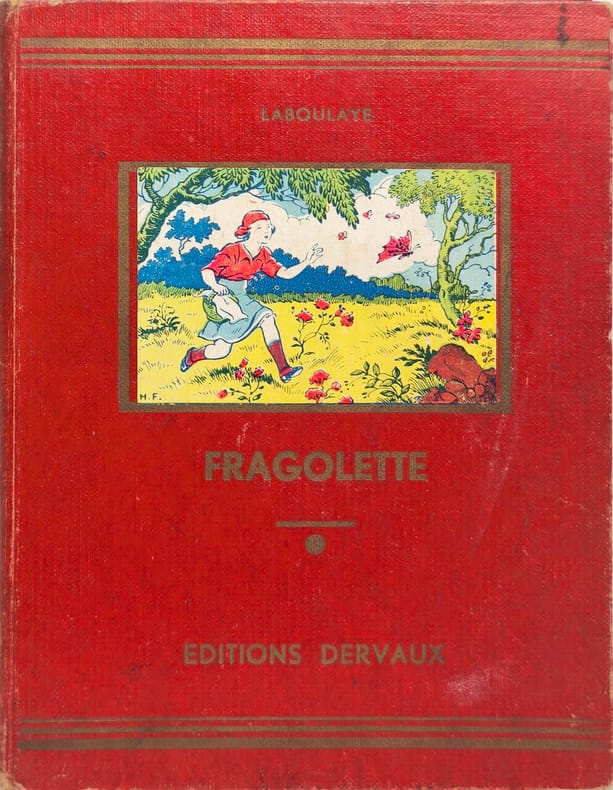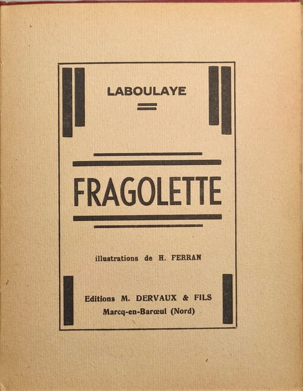 Editions Dervaux 1939 44 pages in8. 1939. cartonnage éditeur. 44 pages. Fragolette est un conte de fées d'Édouard Laboulaye publié en 1884 dans le recueil 'Les Derniers Contes Bleus'. L'histoire met en scène une jeune fille nommée Fragolette qui échappe de justesse à une ogresse sorcière déguisée en vieille femme cette dernière souhaitant la dévorer si elle avait été plus dodue
