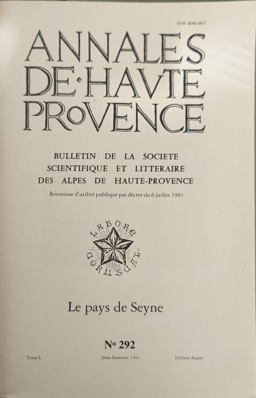 Le pays de seine 1981 191 pages in8. 1981. broché. 191 pages. Il s'agit d'une revue académique publiée par la Société scientifique et littéraire des Alpes-de-Haute-Provence qui a changé plusieurs fois de nom depuis sa création en 1880 (Annales des Basses-Alpes Annales de Haute-Provence puis Chroniques de Haute-Provence). Cette publication semestrielle ou trimestrielle vise à valoriser et faire vivre le patrimoine local de la région