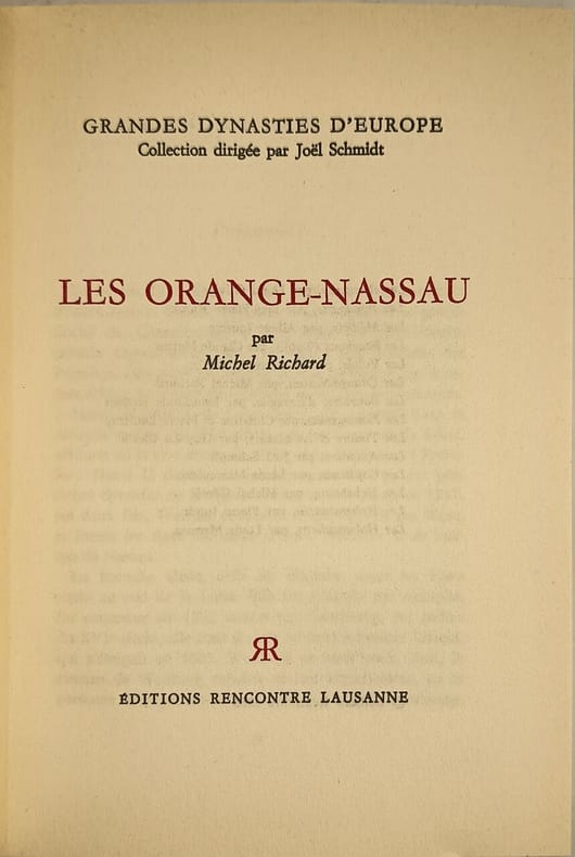 Editions rencontre Lausanne 1968 422 pages in8. 1968. broché. 422 pages. Ce livre retrace l'histoire de la famille noble des Orange-Nassau depuis ses origines en 1020 jusqu'en 1966 en mettant l'accent sur sa longue ascension vers le pouvoir. Il évoque notamment l'empereur Adolphe de Nassau (1292) et la branche aînée Weilburg qui règne sur le Luxembourg au moment de la publication