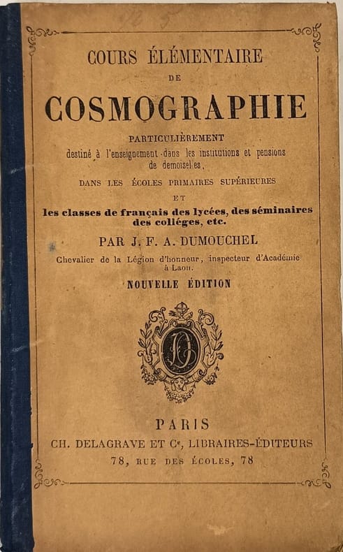 Ch. Delagrave et Cie 1867 144 pages in12. 1867. reliure editeur. 144 pages. Manuel scolaire de cosmographie (astronomie) publié en 1859 conçu pour les élèves des lycées et collèges ainsi que pour les candidats au baccalauréat ès sciences et aux écoles spéciales rédigé conformément aux programmes officiels de l'époque