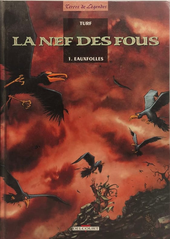 Delcourt 1993 47 pages 31x22 6x1cm. 1993. Cartonnage editeur. 47 pages. La Nef des fous est une série de bande dessinée de Turf publiée chez Delcourt qui plonge le lecteur dans le monde imaginaire et absurde d'Eauxfolles. On y suit les enquêtes rocambolesques de deux enquêteurs dans une ville où règnent le délire les situations improbables et des personnages extravagants comme des trafics de coloquintes géantes et des monstres dans les égouts