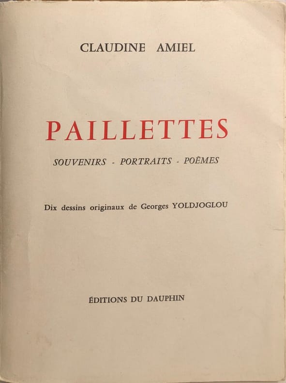 Éditions du Dauphin 1965 173 pages in8. 1965. broché. 173 pages. Recueil poétique de Claudine Amiel publié en 1965 par les Éditions du Dauphin comprenant des poèmes des souvenirs et des portraits souvent accompagné d'illustrations et parfois dédicacé par l'auteur