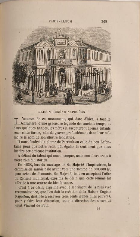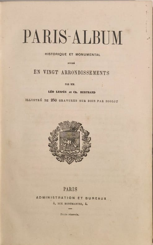 Administration et Bureaux 471 pages in8. Sans date. reliure editeur. 471 pages. Paris-Album est un ouvrage historique et monumental publié en 1861 (ou 1863 ) selon les sources) par Léo Lespès et Charles Bertrand. Il propose une description complète des monuments de Paris organisée selon les vingt arrondissements de la ville après son agrandissement et est illustré par environ 250 gravures sur bois de Diolot. L'ouvrage se présente comme un guide destiné à la fois aux étrangers et aux Parisiens offrant un tableau du nouveau Paris sous le Second Empire