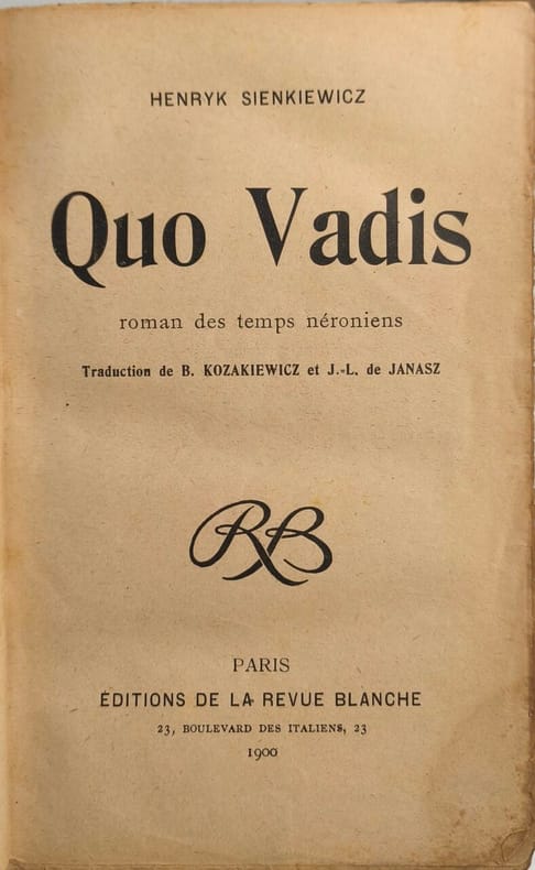 Éditions de la Revue Blanche 1900 645 pages in8. 1900. reliure editeur demi toile. 645 pages. Quo Vadis est un roman historique de Henryk Sienkiewicz qui se déroule dans la Rome antique sous le règne de l'empereur Néron. Il mêle une histoire d'amour entre le tribun romain Marcus et la chrétienne Ligia aux persécutions des premiers chrétiens dépeignant la vie quotidienne les jeux du cirque et les excès de la société romaine