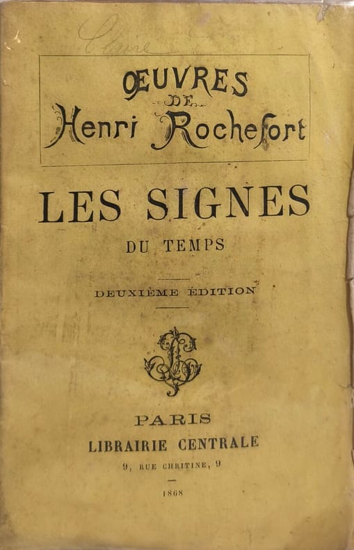 Librairie Centrale 1868 302 pages in8. 1868. broché. 302 pages. Les signes du temps est un ouvrage de Henri Rochefort publié en 1868 troisième série de la collection 'Français de la décadence'. Ce livre réimprimé dans le cadre d'un programme de conservation patrimoniale reflète des courants de pensée caractéristiques de son époque qui pourraient être jugés condamnables aujourd'hui