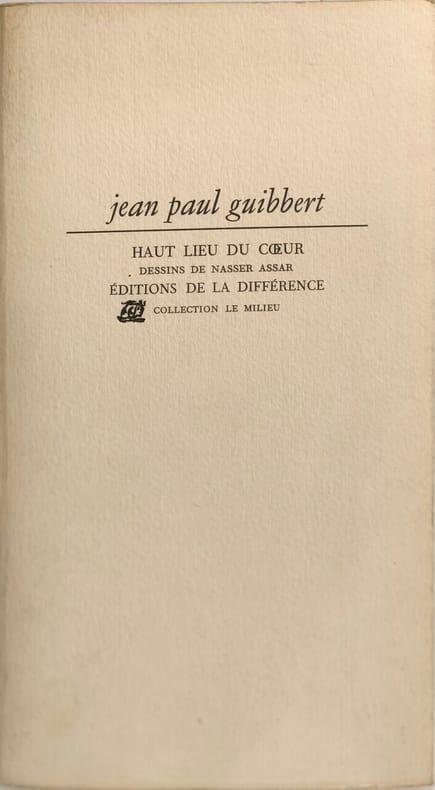 Éditions de la Différence 1976 98 pages in8. 1976. Broché couverture rempliée. 98 pages. Haut lieu du cœur est un ouvrage de Jean-Paul Guibbert publié en 1976 aux Éditions de la Différence dans la collection 'Le Milieu'. Le livre est illustré par des dessins de l'artiste Nasser Assar et se présente comme une édition originale comportant 98 à 99 pages