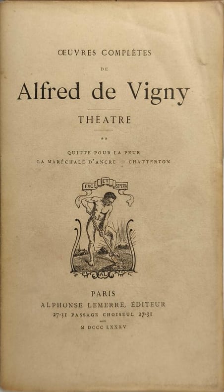 Alphonse Lemerre Éditeur 1886 418 pages in12. 1886. broché. 418 pages. Cette édition critique du théâtre complet d'Alfred de Vigny présente l'œuvre d'un dramaturge romantique majeur convaincu de la nécessité de rénover le genre théâtral mais qui finit par abandonner cette tribune. L'édition revue sur manuscrits et contextualisée dans les débats de l'époque comprend ses trois pièces originales ainsi que des traductions et adaptations