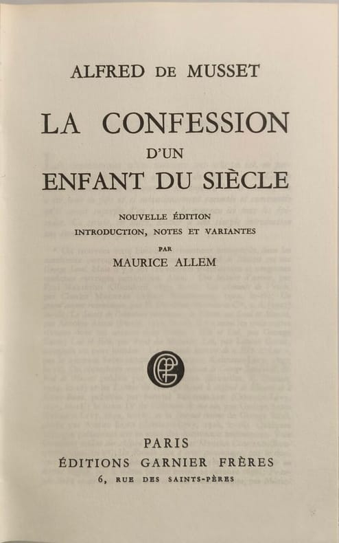 Éditions Garnier Frères 1956 345 pages in8. 1956. reliure editeur sous rodhoid. 345 pages. Roman autobiographique publié en 1836 où Alfred de Musset à travers le personnage d'Octave relate sa relation passionnelle et douloureuse avec George Sand. L'œuvre explore la désillusion le « mal du siècle » qui touche sa génération et constitue un témoignage emblématique du mouvement romantique
