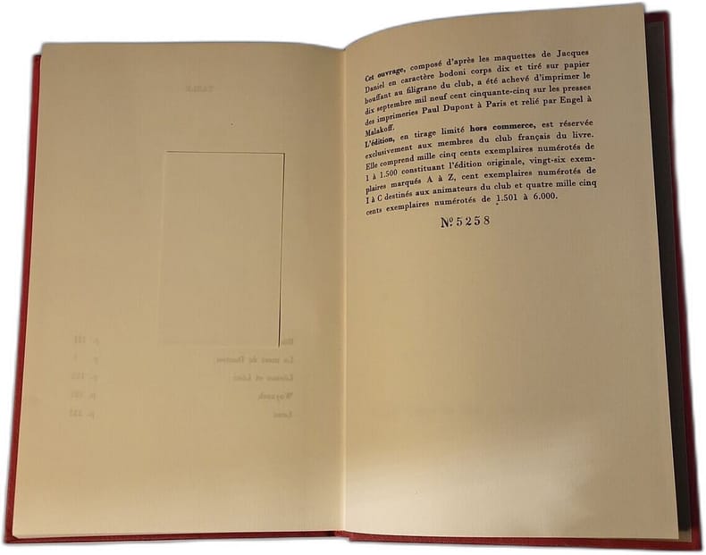Ouvrage composé d'après les maquettes de Jacques Daniel et tiré sur papier bouffant. Tirage limité hors commerce réservé aux membres du Club. Bel exemplaire. Photos sur demande.