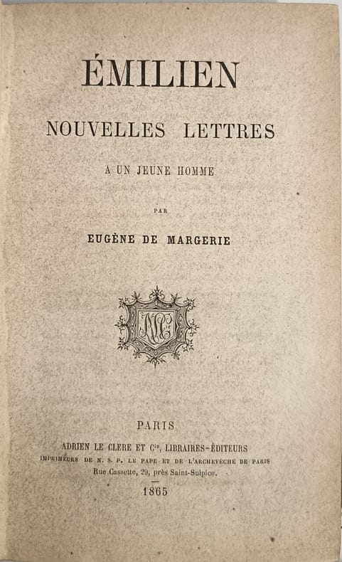 Adrien Le Clerc et Cie 1865 452 pages in8. 1865. reliure éditeur demi basane dos à nerfs. 452 pages. Recueil de lettres adressées à un jeune homme écrit par l'auteur catholique Eugène de Margerie et publié en 1865. L'ouvrage s'inscrit dans une tradition de conseils moraux et spirituels