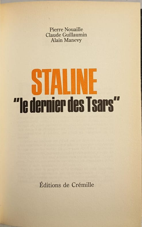 Éditions de Crémille 1990 253 pages in8. 1990. reliure editeur. 253 pages. Biographie de Joseph Staline présentée comme le dernier des tsars soulignant la continuité entre l'autocratie tsariste et son régime totalitaire. L'ouvrage fait partie de la collection "Les personnages maudits de l'Histoire" qui se concentre sur des figures historiques controversées