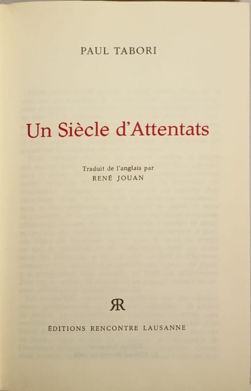 ÉDITIONS RENCONTRE LAUSANNE 1969 565 pages in8. 1969. reliure editeur. 565 pages. Ouvrage documentaire de Paul Tabori traduit de l'anglais qui propose une étude historique des attentats au cours d'un siècle illustrée par de nombreuses planches photographiques en noir et blanc