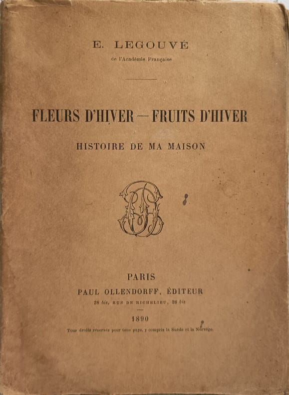 Paul Ollendorff 1890 231 pages in8. 1890. broché. 231 pages. Dans ce livre publié en 1890 Ernest Legouvé propose une réflexion autobiographique et philosophique sur sa vie et ses relations utilisant la métaphore des "fleurs d'hiver" et des "fruits d'hiver" pour évoquer les joies tardives de l'affection et de la sagesse