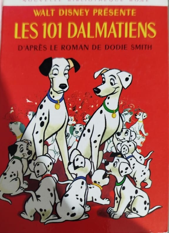 Hachette 1967 collection bibliotheque rose illustrée. in12. 1967. cartonnage editeur. Roman jeunesse de Dodie Smith paru en 1956 racontant l'aventure de Pongo et Missis un couple de dalmatiens qui partent à la rescousse de leurs chiots volés par la cruelle Cruella Diabolo (ou Cruella) qui souhaite en faire un manteau de fourrure. Leur quête à travers la campagne anglaise est soutenue par un réseau de chiens dans une histoire pleine d'humour de gaieté et traitant des thèmes de l'amour familial et de la solidarité