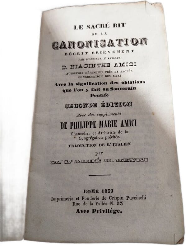 Crispin Puccinelli 1839 80 pages in12. 1839. broche couverture muette. 80 pages. Ouvrage de Hyacinthe Amici ancien défenseur près la Sacrée Congrégation des Rites qui décrit brièvement le rituel sacré de la canonisation dans l'Église catholique en expliquant notamment la signification des oblations faites au Souverain Pontife