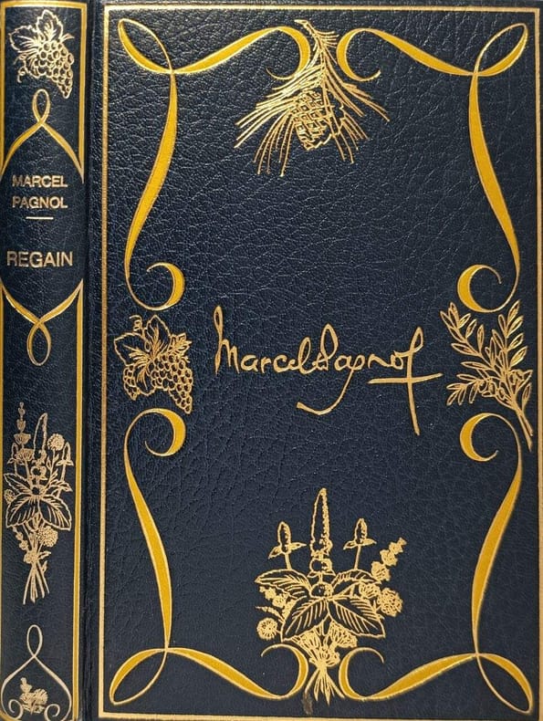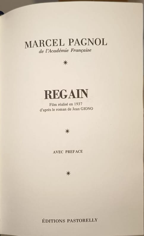 Éditions pastorelly 1973 254 pages in8. 1973. reliure editeur. 254 pages. Regain est l'adaptation par Marcel Pagnol du roman de Jean Giono publiée en 1937. L'histoire raconte la renaissance du village provençal d'Aubignagne où le dernier habitant Panturle retrouve goût à la vie grâce à la rencontre d'une jeune femme. Cette édition de 1973 des Éditions Pastorelly est une version illustrée par Suzanne Ballivet avec une reliure cuir et des photographies du film