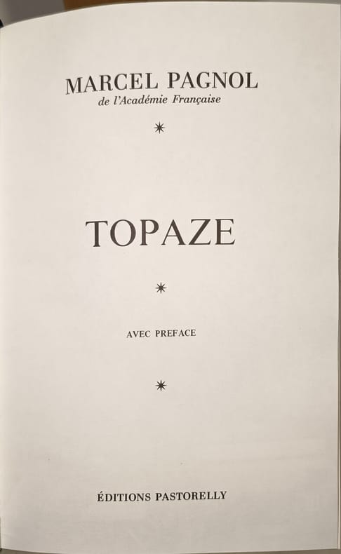 Editions Pastorelly 1973 337 pages in8. 1973. reliure editeur. 337 pages. Topaze est une pièce de théâtre de Marcel Pagnol créée en 1928 qui raconte l'histoire d'un modeste et honnête professeur Albert Topaze. Embauché comme prête-nom par un conseiller municipal véreux il se retrouve plongé dans le monde cynique de la bourgeoisie et de l'argent où il finit par adopter les méthodes de ceux qu'il méprisait initialement. C'est une comédie satirique sur la corruption et la puissance de l'argent