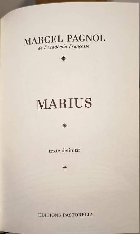 Editions Pastorelly 1973 297 pages in8. 1973. reliure editeur. 297 pages. Marius fils de César qui tient un bar sur le Vieux-Port de Marseille dans les années 1920 est déchiré entre son amour pour Fanny une marchande de coquillages et son désir obsessionnel de prendre la mer pour découvrir le monde. Cette pièce en quatre actes constitue le premier volet de la trilogie marseillaise de Marcel Pagnol