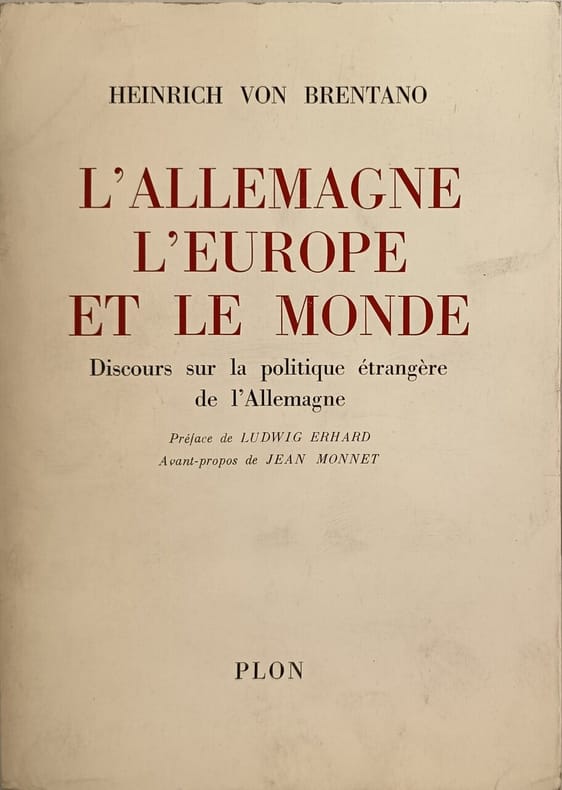 Plon 1965 362 pages in8. 1965. Broché couverture rempliée. 362 pages. Ce livre est un recueil de discours de Heinrich von Brentano ancien ministre des Affaires étrangères ouest-allemand sur la politique étrangère de l'Allemagne après la Seconde Guerre mondiale. Il aborde la place de l'Allemagne en Europe et dans le monde avec une préface de Ludwig Erhard et un avant-propos de Jean Monnet